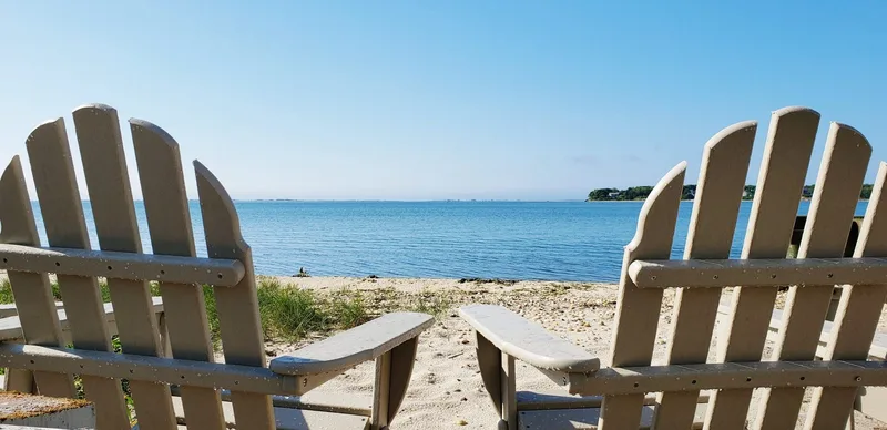 Our on-property bay beach on Shinnecock Bay features loungers, Adirondack chairs, and shade. Lifeguards not on duty — swim with caution.
